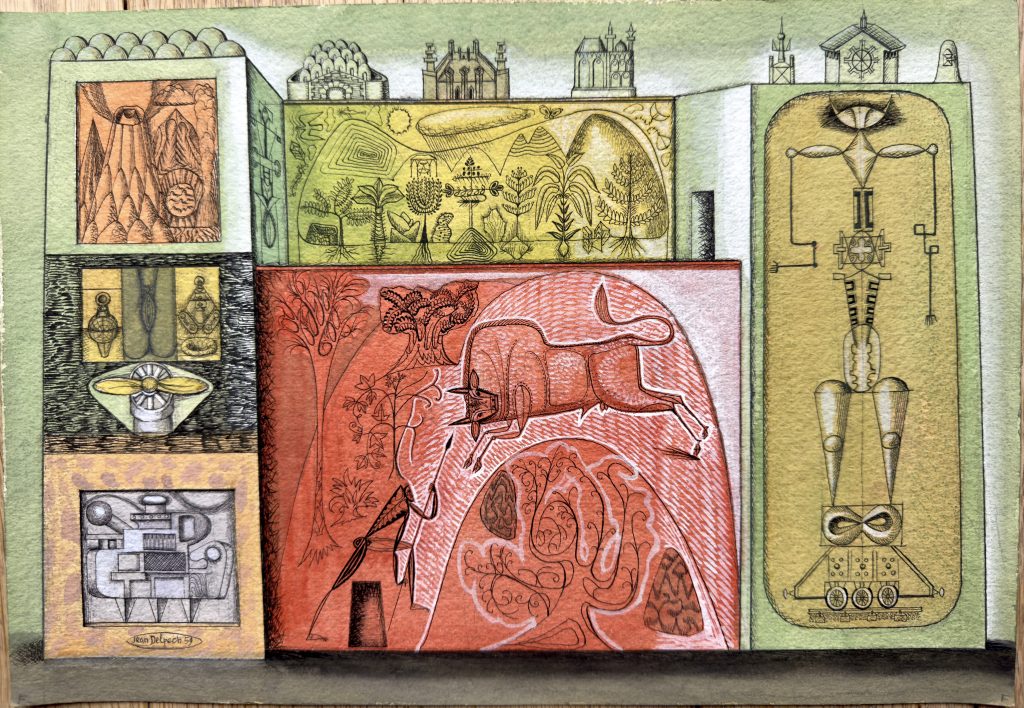 Technique : Peinture gouache et encre sur papier – Gravure d’un élève repeinte