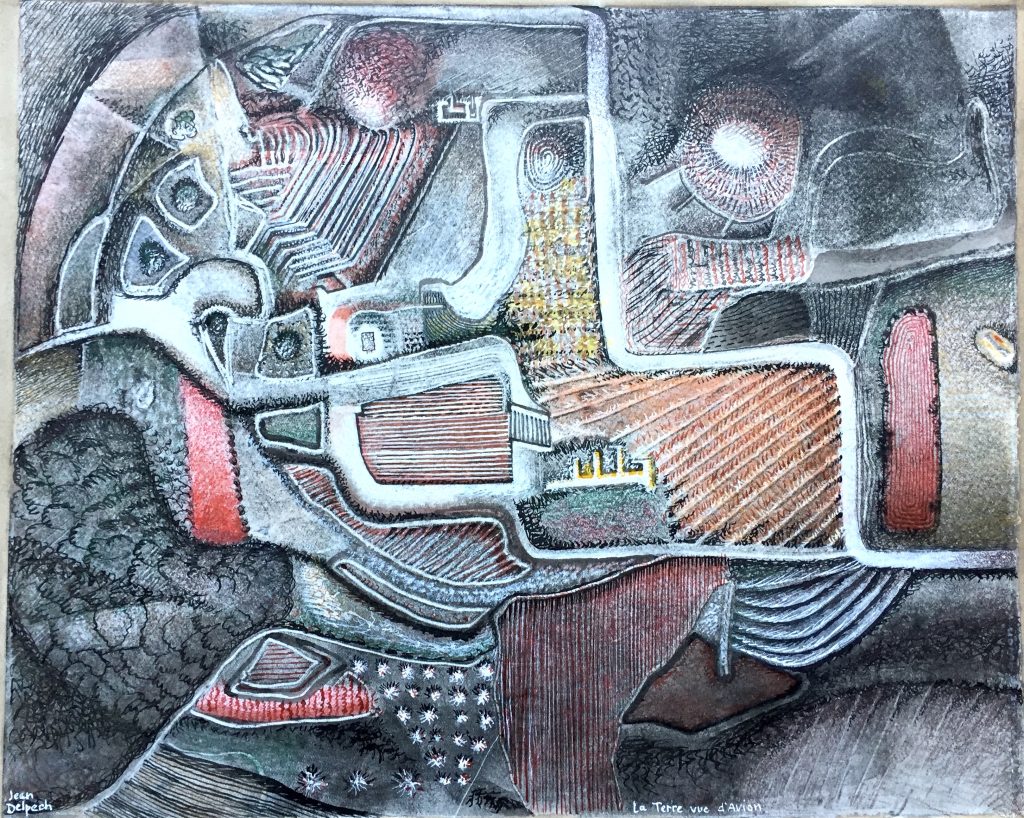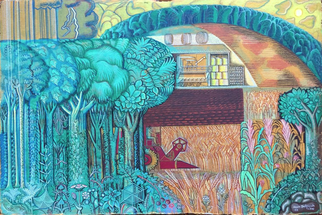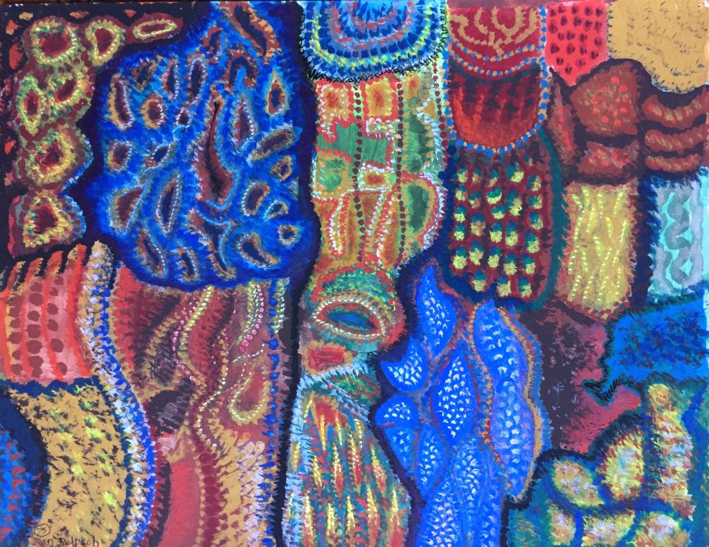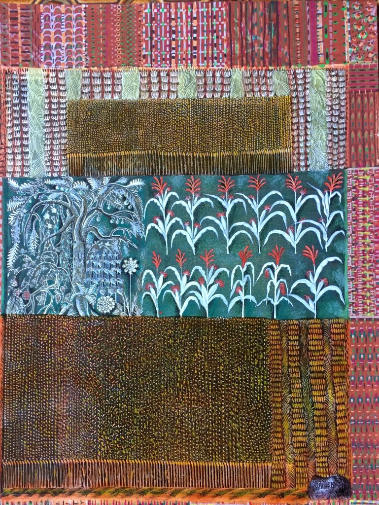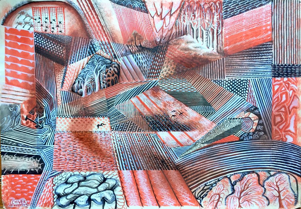 Technique : Peinture gouache sur papier + encre – Gravure d’un élève reprise à la gouache