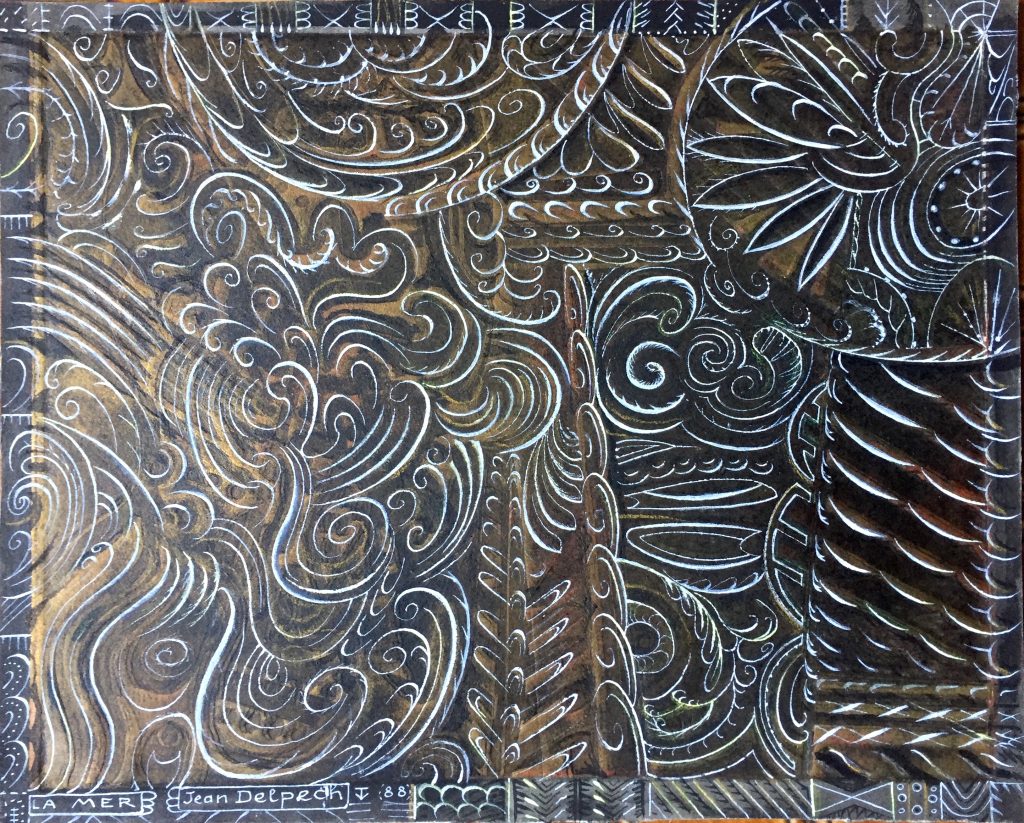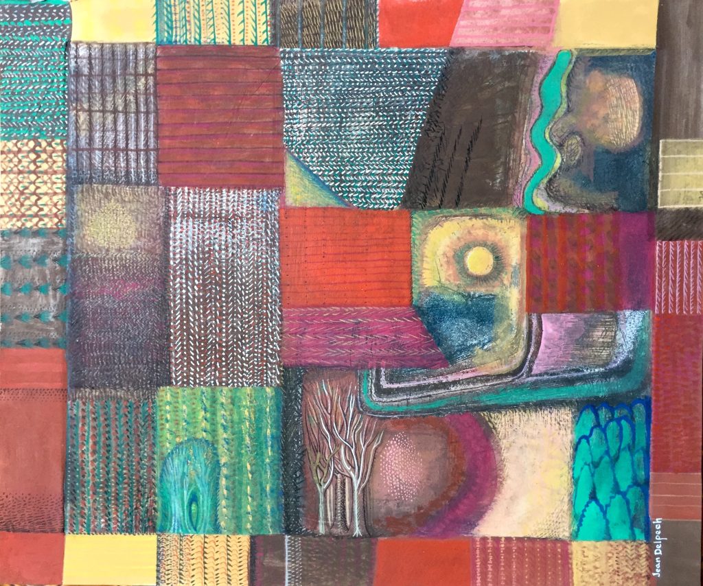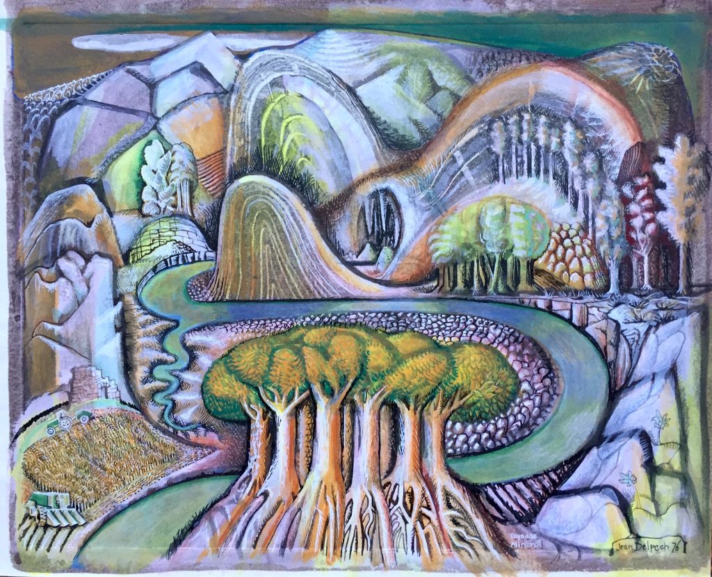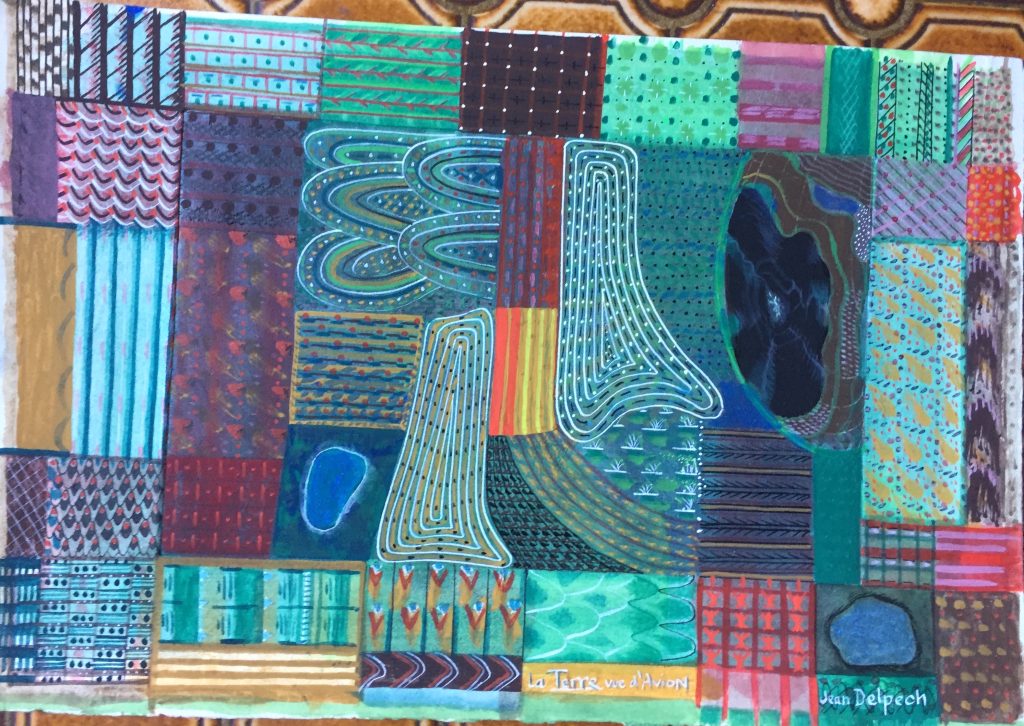 Technique : Peinture gouache sur papier + encre – Gravure d’un élève reprise à la gouache