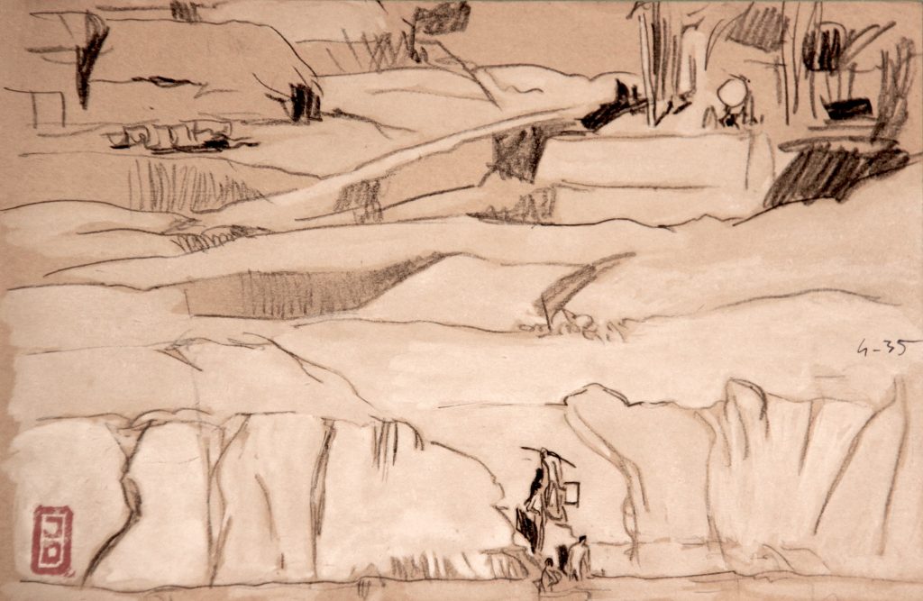 Dessins IndochineMarineTerre FleuveFleuveDimensions : 13X20 cmTechnique : Crayon et aquarelle (ou encre?)Date : 04/1935
