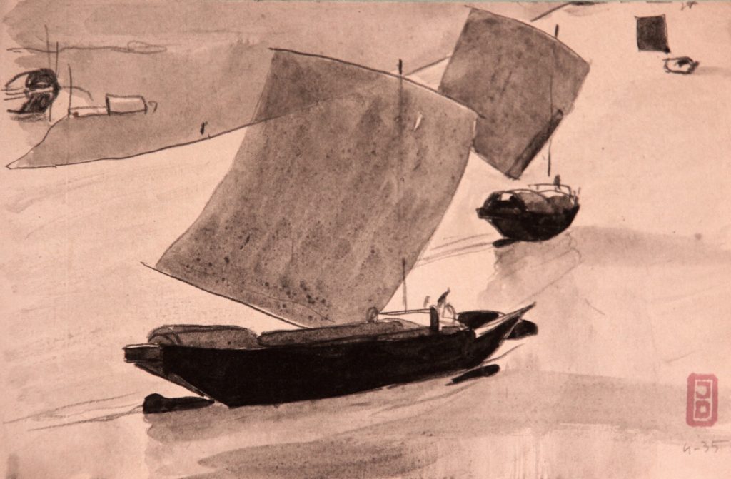 Dessins IndochineMarineTerre Deux bateauxDeux bateauxDimensions : 20X13 cmTechnique : Crayon et aquarelleDate : 1935 ?
