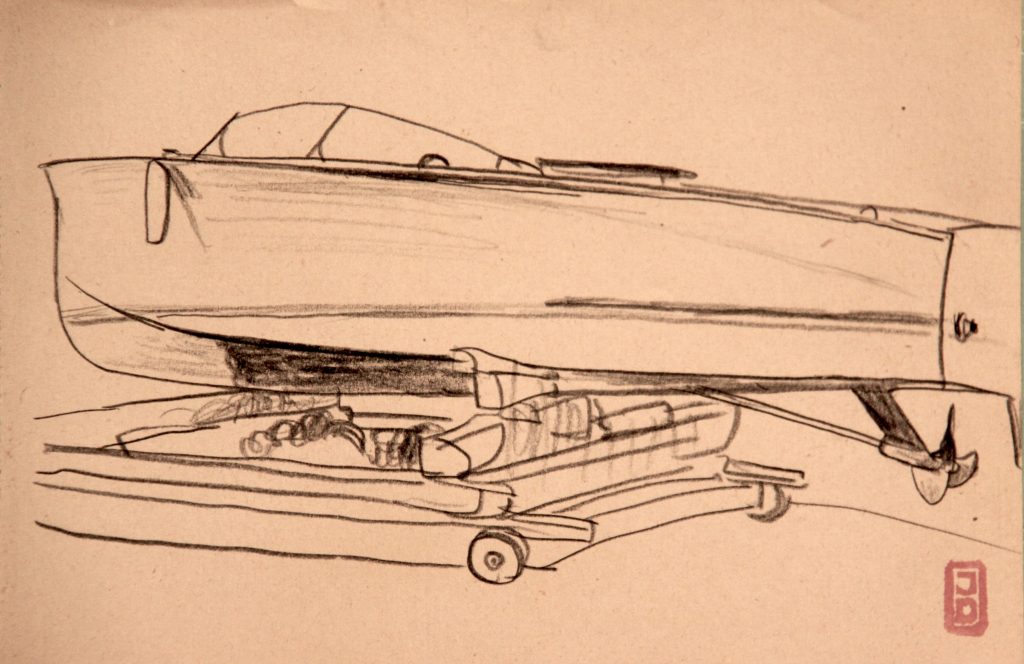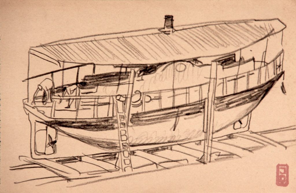 Dessins IndochineMarineTerre Bateau au chantierBateau au chantierDimensions : 13X20 cmTechnique : Crayon sur papierDate : 1935 ?
