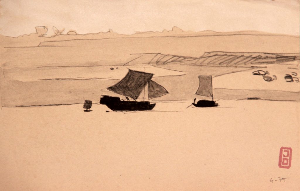 Dessins IndochineMarineTerre FleuveFleuveDimensions : 13X20 cmTechnique : Crayon et aquarelleDate : 04/1935